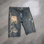 Heavily distressed medium wash bermuda shorts with swarovski crystal trimming along sides.