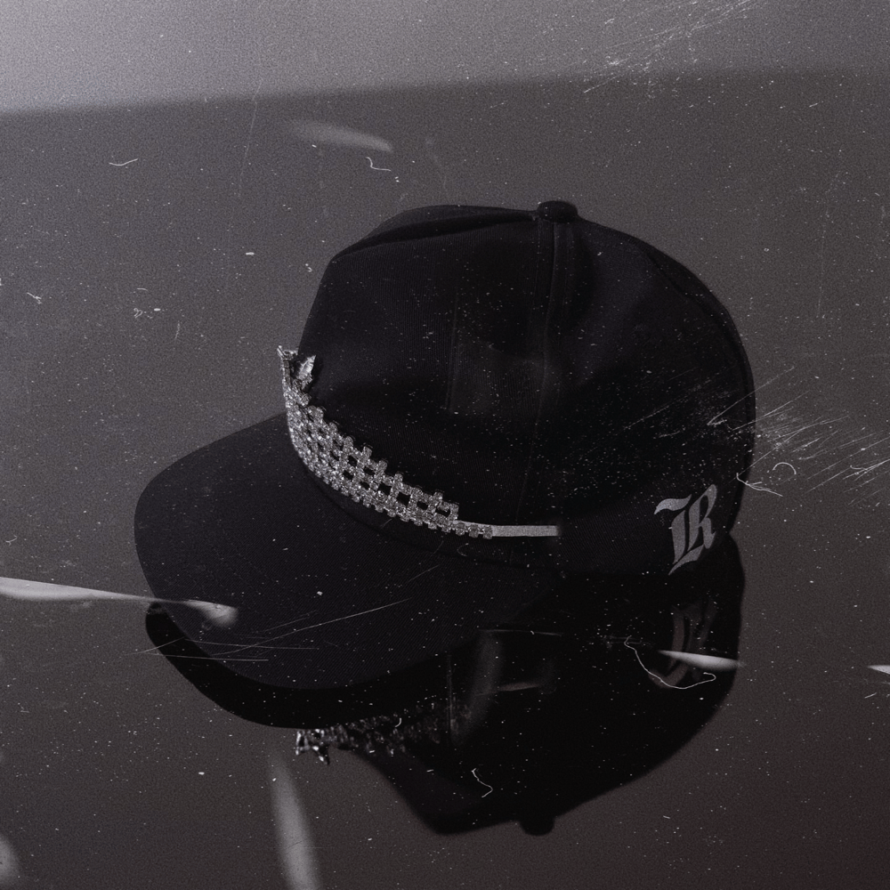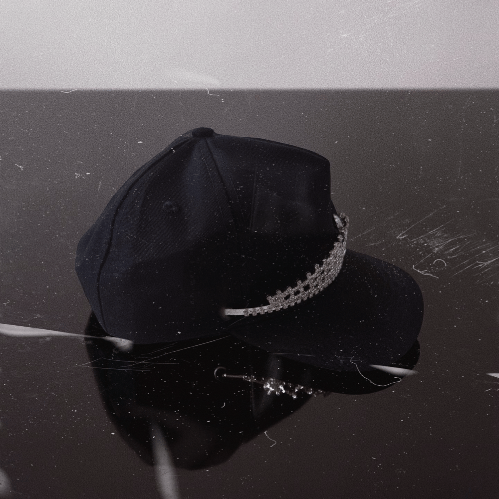 The R Tiara Hat transforms a classic structured black snapback into a statement piece. Crafted in a sleek, deep black cotton twill, this cap features a hand-applied crystal tiara detail wrapped across the front panel and brim — designed to catch light from every angle. The lattice-set rhinestones are finished with a marquise center stone, giving the illusion of a floating crown against matte black fabric.